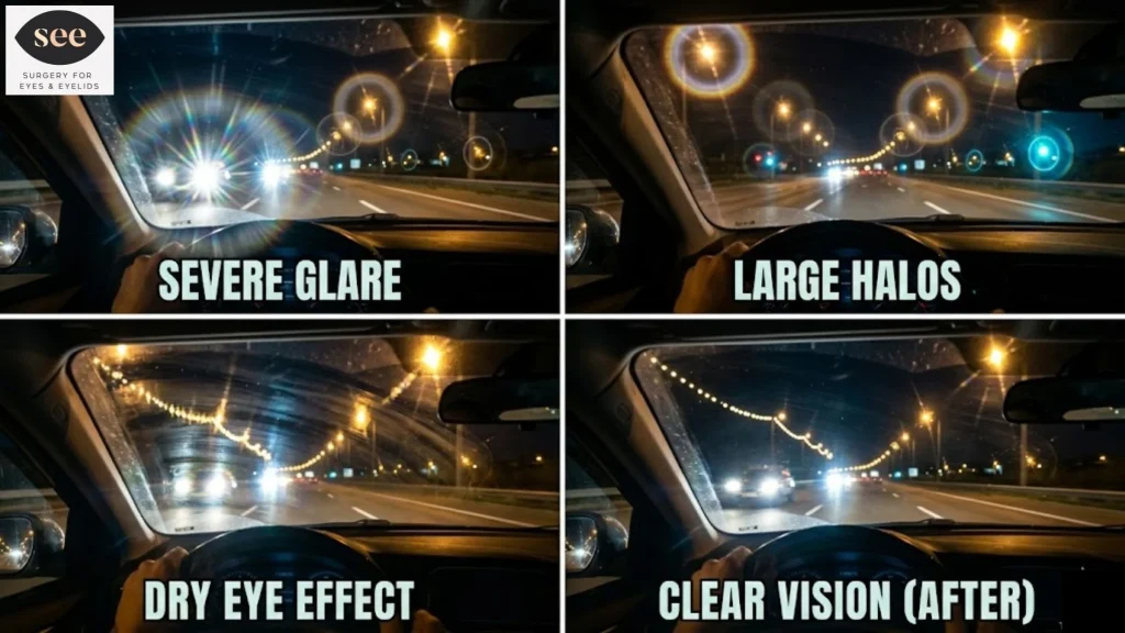 If you find yourself gripping the steering wheel tighter or squinting at oncoming traffic, you aren’t just “getting older”—you are experiencing a physiological shift in how your eyes process light. At The SEE Clinic, we frequently hear patients ask: “Why are lights blinding me at night?” Understanding the relationship between glare and halos at night driving is the first step toward regaining your freedom on the road and protecting your long-term ocular health.